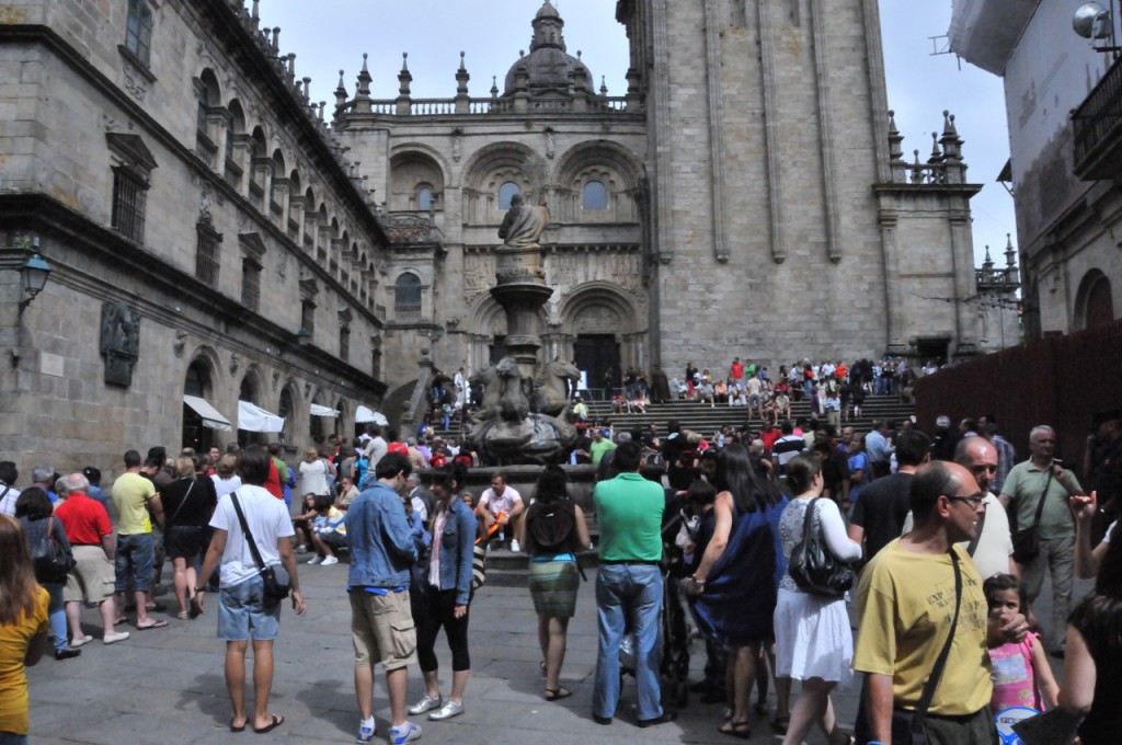 Dagens mål – liksom pilgrimernas – var . Vi cyklade till järnvägsstationen där vi tog tåget. 30 minuter senare steg vi av i Santiago de Compostela och började vår vandring till katedralen. På vägen dit möte vi många pilgrimsvandrare, en del såg pigga ut en del mer slitna med diverse sviter efter vandringen. Påfallande många hade problem med sina knän. När vi kom till katedralen såg vi pilgrimerna, tillsammans med turisterna köa framför katedralen i timmar! Nog kunde väl pilgrimerna fått en egen kö, det tycker jag de förtjänat! Efter att tagit en öl på kaféet vid katedralen och sett på ”spektaklet”, gjorde vi ett försök att gå in i katedralen, då vi hittade en kö som av någon anledning var bara ett 20-tal meter. Jag blev dock stoppade, vakten som ansåg mig nog ej tillräkligt gudfruktig – eller kan det berott på min ryggsäck?? – jag kom dock ej in, men Lena uppfyllde alla kriterier och släpptes in! Lena kunde då konstatera att anledningen till den korta kön var att den ingången inte ledde till apostelns grav. I en kyrka som jag faktiskt kom in i kunde jag konstatera att även inom kyrkan sker automatisering. Här stoppade man pengar i ett myntfack och så tändes en lampa i ett ljus, man kunde inte ens välja vilket ljus som skulle tändasJ! Måste erkänna att det inte kändes som något framsteg – tekniken kan gå lite väl långt! På torget träffade jag en pilgrimsvandrare (eller jag ville i alla fall tro det), fick aldrig riktigt klarhet i det, då han bara talade spanska. När pilgrimsvandrarna kom fram, kunde de på ett kontor köp sin ”Compestella”, som ett bevis på att de pilgrimsvandrat.