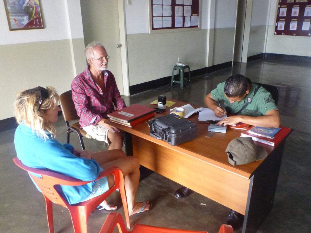 De var mycket vänliga. Skrev in våra uppgifter i ett kollegieblock(!) och förklarade att vi nu hade tillträdde till hela flodsystemet. Jag frågade om vi inte kunde få några stämplar i passen som bevis på att vi checkat in. Men nej det kunde vi inte. Då fick vi åka upp till Tulipita och där kunde vi checka in och då skulle vi kunna färdas i hela Venezuela. Det var bara att nöja sig med detta.