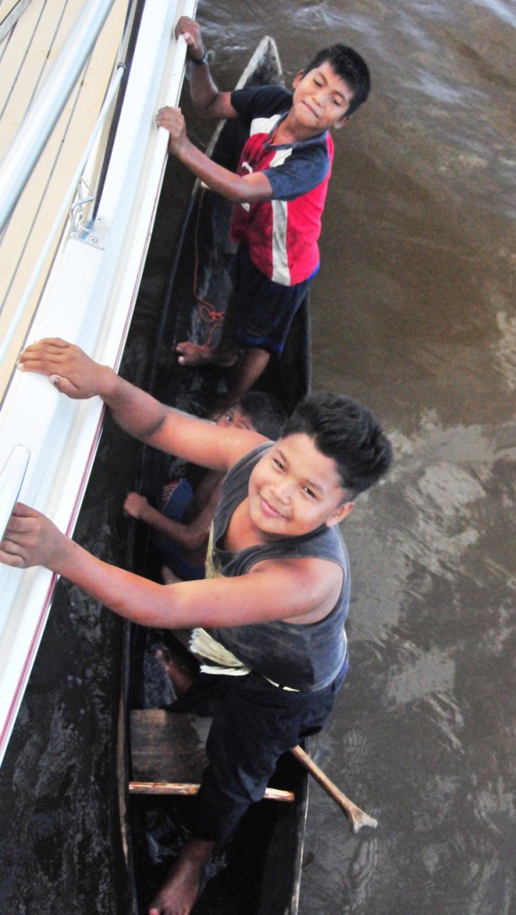 Alla indianerna vi möte var väldigt vänliga och lite nyfikna och tyckte det var roligt att bara titta. Så det var uppenbart att det inte var många båtar som kom här. För oss västerlänningarna med barnsäkerhet etc så fick vi först hjärtat i halsgropen när vi såg en pojke på kanske 5 – 6 år som kom ut paddlande med sina mindre broder. Och inte nog med att de paddlade ut på en strid flod med en kanot vars fribord knappt sträckte sig över vattenytan, den läckte dessutom så att de hela tiden måste ösa! (Jag har varit med om en liknande situation i Kenya, där Masai pojkar på 7 – 8 år gick och vaktade boskapen i form av kor. Bara 4 kilometer bort hade vi sett 3 lejonhonor och deras ungar ….) Nu är det inte så att dessa naturfolk inte är rädda och måna om sina barn. Det fick jag bevis på senare på kvällen, utan de uppfostras på ett annat sätt än våra barn. Vet inte vilket som är rätt, men det skulle vara intressant med en studie. Mår barn som får ta ett större ansvar tidigt bättre? Ja, jag kan bara säga att de barn jag möte visade både prov på glädje, harmoni och nyfikenhet. S